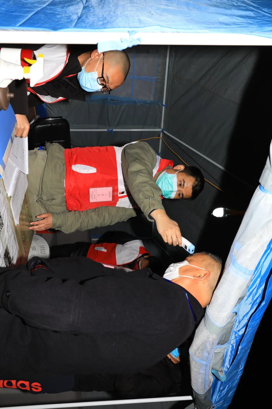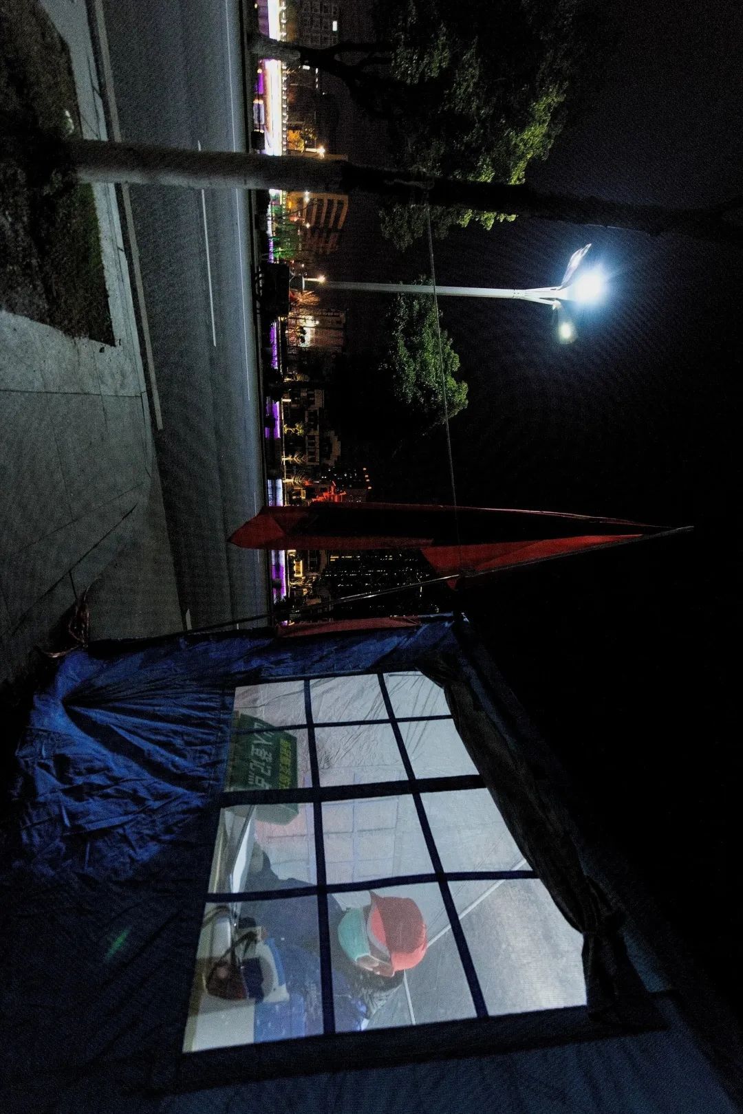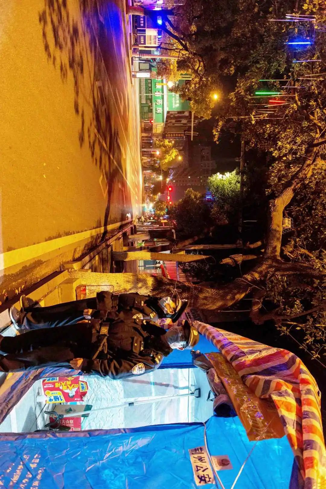 1:00 深夜里寒气逼人,春雨亭小区洪湖市应急管理局值守点的两名工作人员在临时帐篷里小憩。