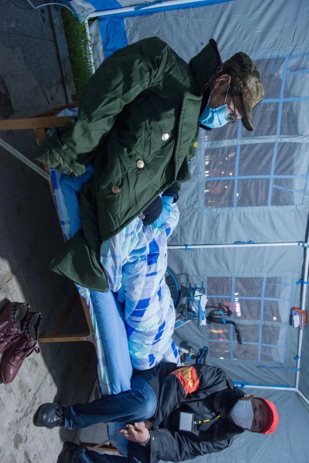 22:00 在中央花园小区教育局值守点,值守人员在临时帐篷里使用取暖器取暖。