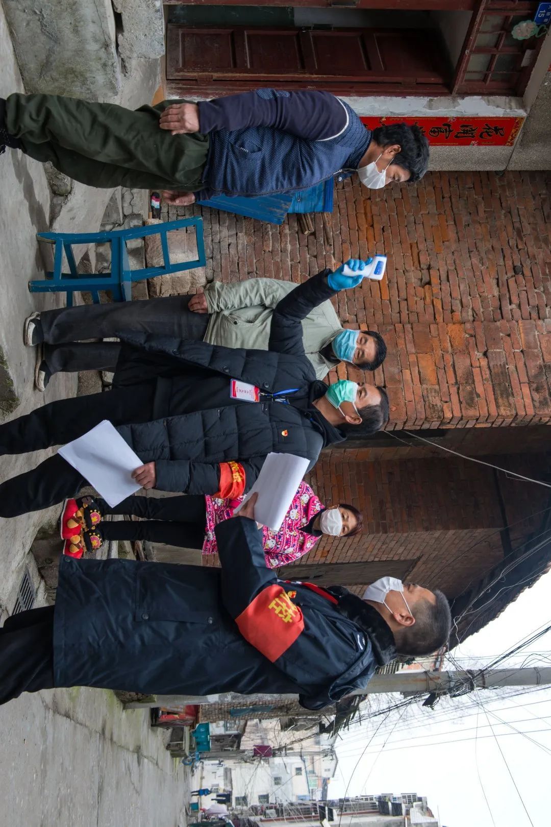 10:00 在朝阳社区,税务局值守人员逐户抽查居民体温,他们没有丝毫松懈,一边盯着额温枪的数值,一边进行记录。