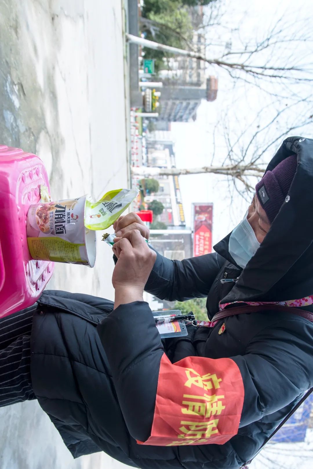 12:00 由于疫情,洪湖市餐饮店均暂停营业,为了节省时间,市妇联沿河东路值守点工作人员午餐用方便面解决。