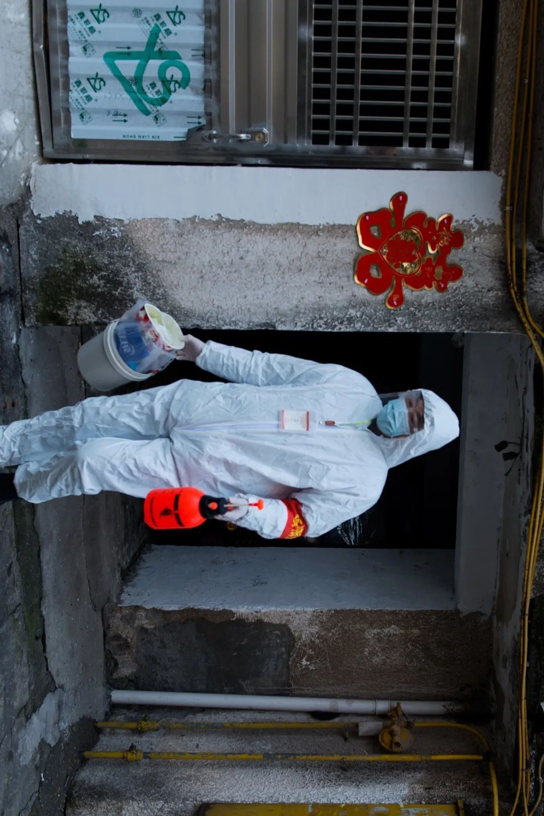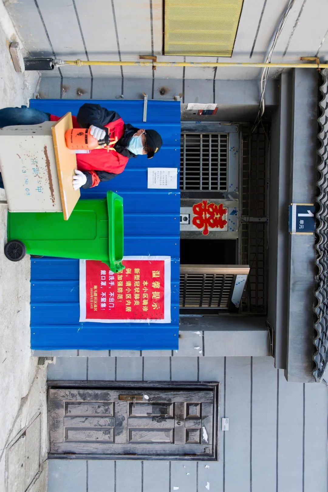 17:00 锦绣东城小区教育局值守点,值守人员正在值守封闭的楼道。为坚决防止疫情扩散蔓延,最大限度减少人员流动,保证人民群众生命健康,洪湖市对确诊人员所在单元进行彻底消杀后实行封闭管控,在单元门外贴警示标识,禁止居民进出。
