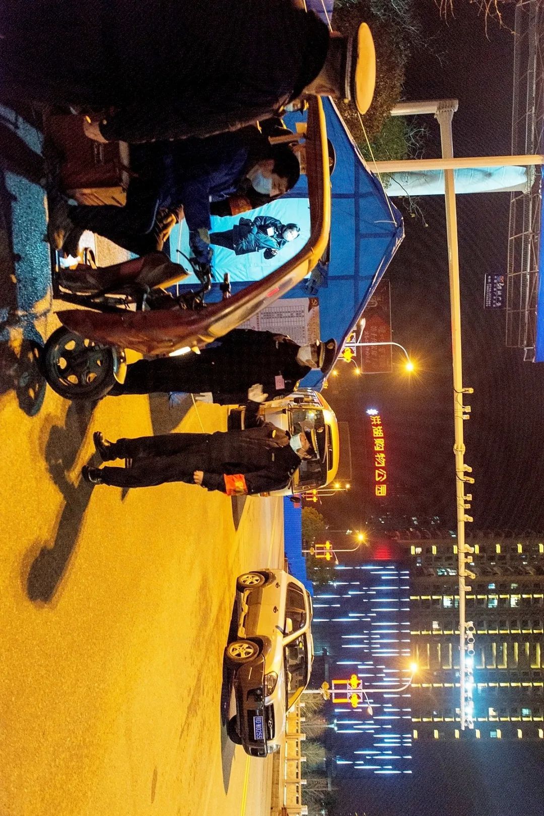 18:00 夜幕降临,在一桥头东,城管执法局值班人员正在对经过车辆进行检查、登记。
