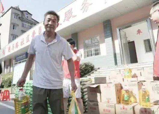 老人们有序领取物资