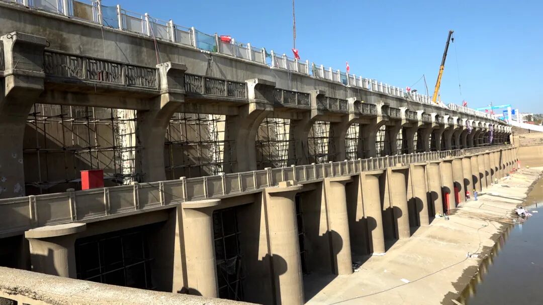 现已完成四孔的二期混凝土浇筑,总共有23孔,还有19孔二期混凝土浇筑。23孔闸门全部吊装下去后,开展进水渠和出水渠的修复以及启闭机房排架柱、闸室的重建。