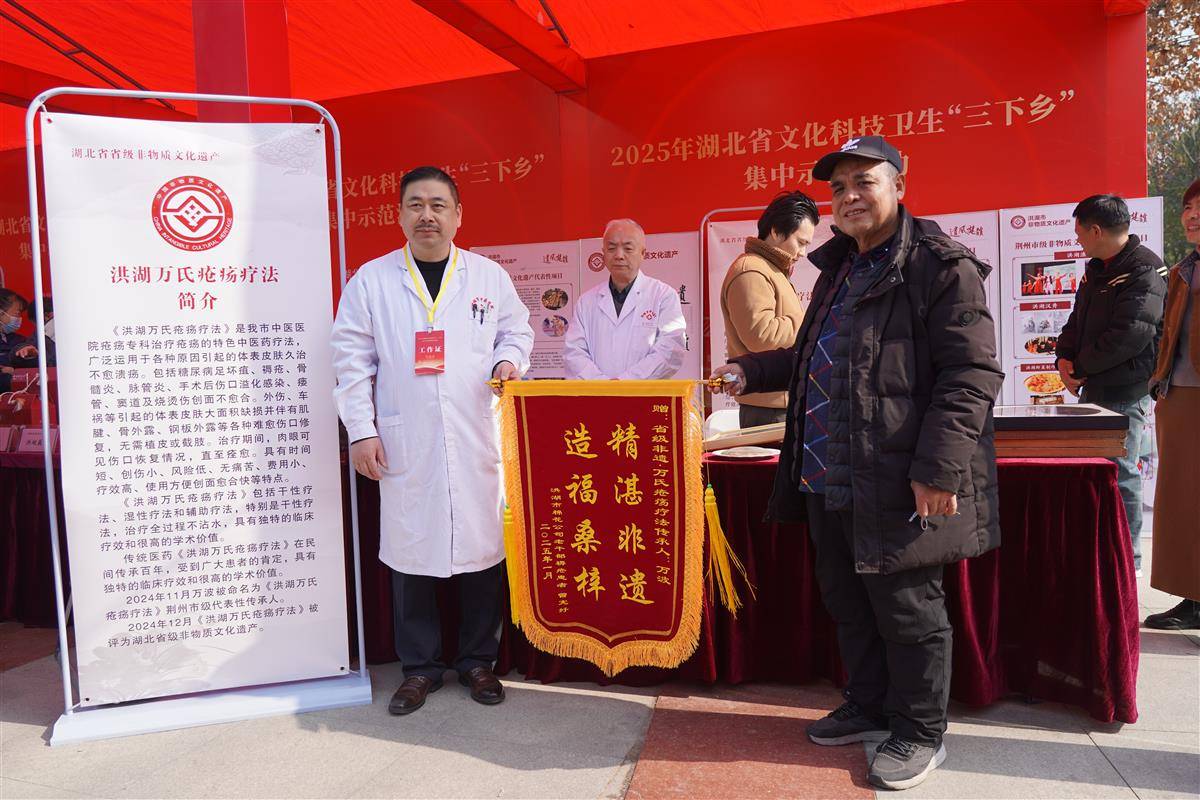 隔壁,褥疮患者曾宪好特地给洪湖市中医医院医生万波送来锦旗表示感谢,2024年12月《洪湖万氏疮疡疗法》被评为湖北省级非物质文化遗产。“很多疮疡患者都不方便,我都会上门给他们换药。”作为《洪湖万氏疮疡疗法》荆州市级代表性传承人,万波经常下乡镇、进农家,为患者带来最有效的治疗方法。