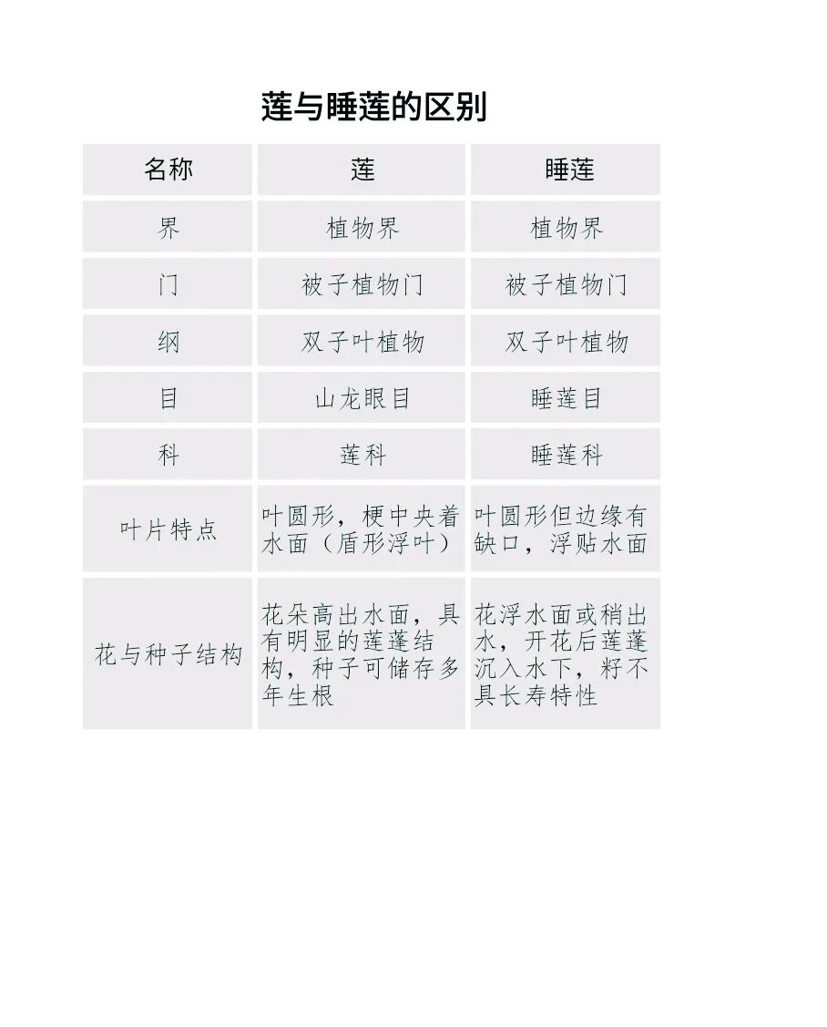莲与睡莲虽然名字相近,但分类学、结构、生理和用途均不同。只有莲才有莲藕、莲蓬,以及长期可保存发芽的种子——莲子。莲科曾被早期分类系统归入睡莲科,但现代分子系统分析显示,二者只是趋同进化。从大的植物学分类来看,与美味的杨梅果(杨梅科)和美丽的玉兰花(木莲科)一样,莲与睡莲的亲缘关系到双子叶植物纲就截止了,的确有点远。