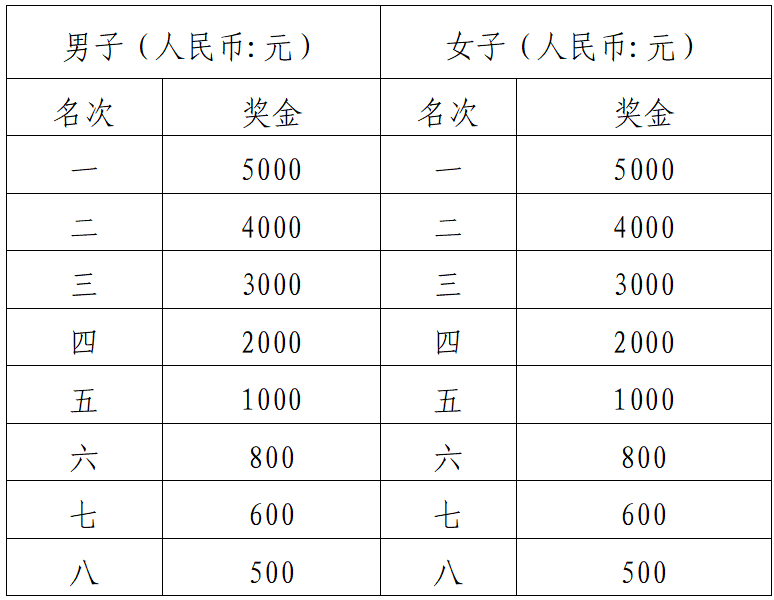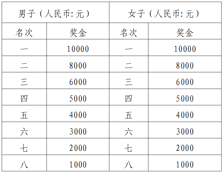 (一)马拉松项目名次奖,男女前八名以枪声计时成绩进行排名,具体奖金如下表: