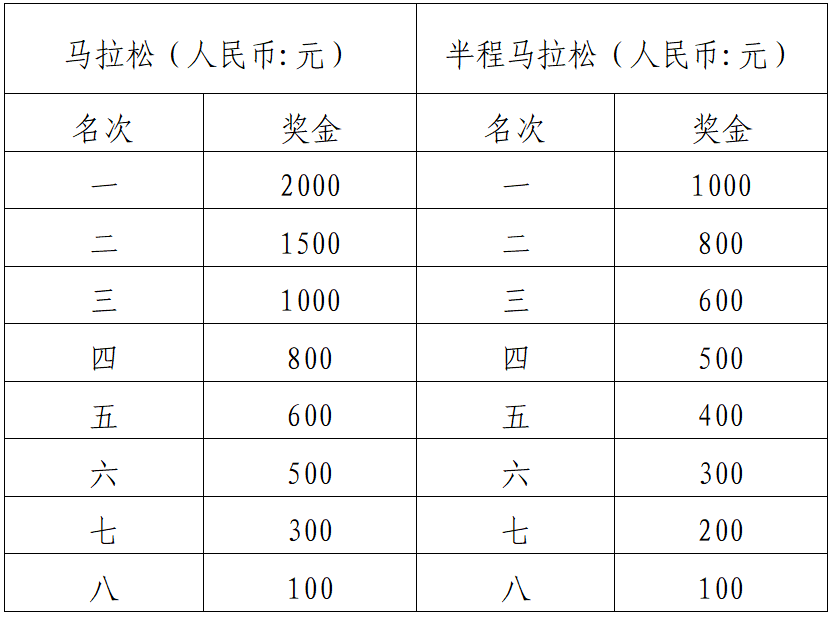 (二)半程马拉松项目名次奖,男女前八名以净计时成绩进行排名,具体奖金如下表: