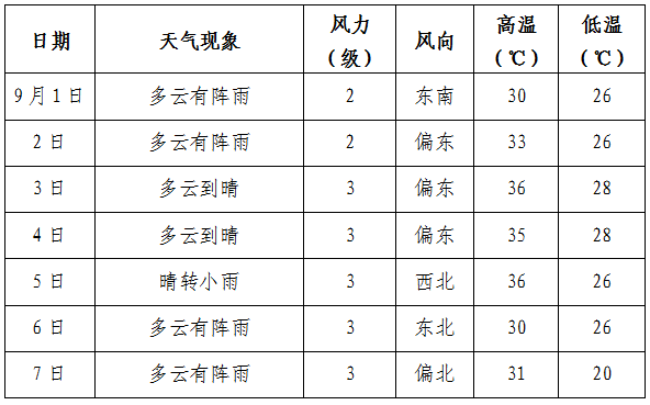 8月30日,阴,有分散性阵雨,26-35℃