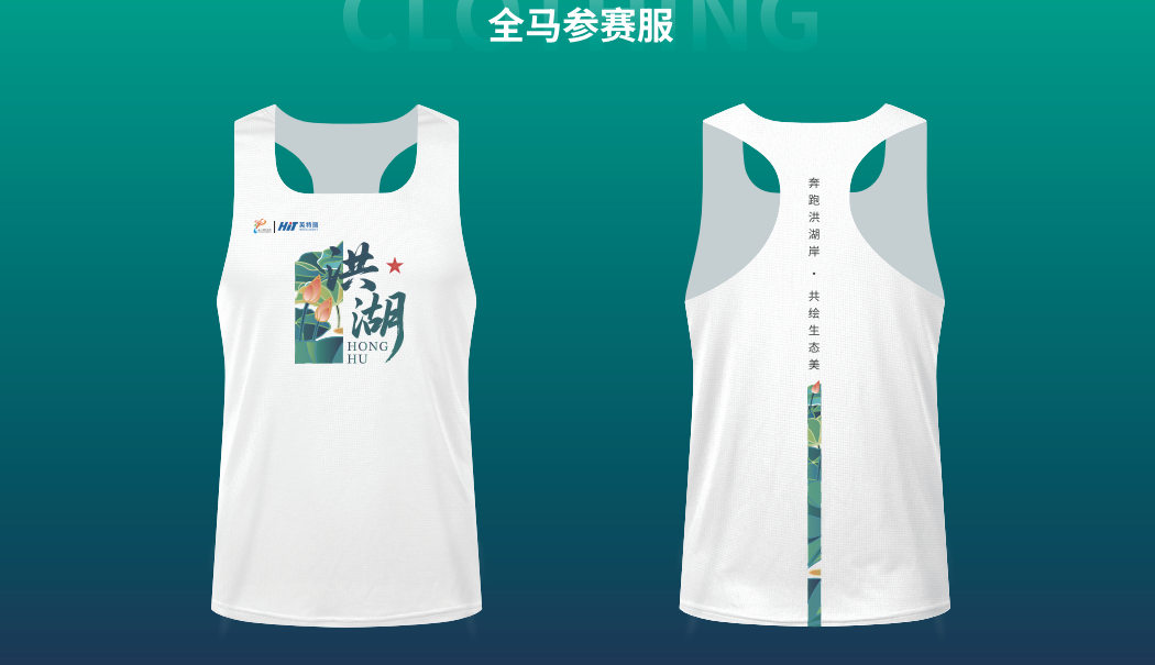 赛事服装主体为白色,正面印有洪湖中英文字样以及荷花荷叶图案,清新雅致,凸显洪湖的生态气质。背面有“奔跑洪湖岸・共绘生态美”的标语,时刻提醒着大家赛事主题。中线的图案设计,也与洪湖的自然元素相呼应,整体简洁又富有辨识度,穿着它奔跑在洪湖岸,能让跑者更好地融入这片生态与红色交融的土地。