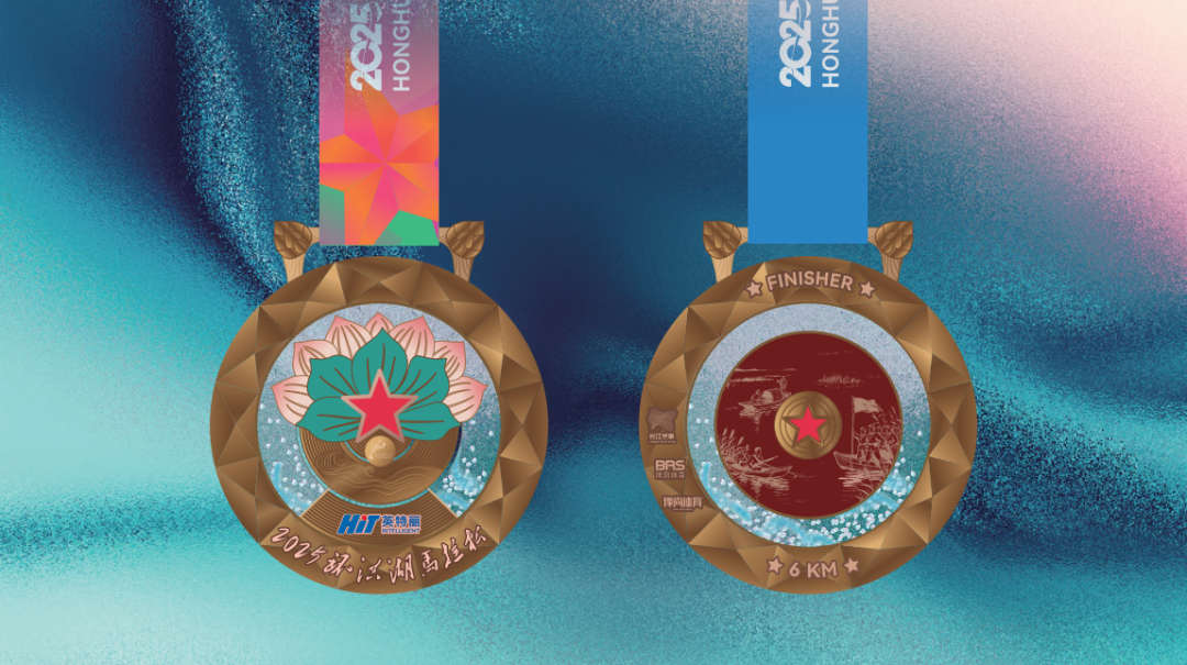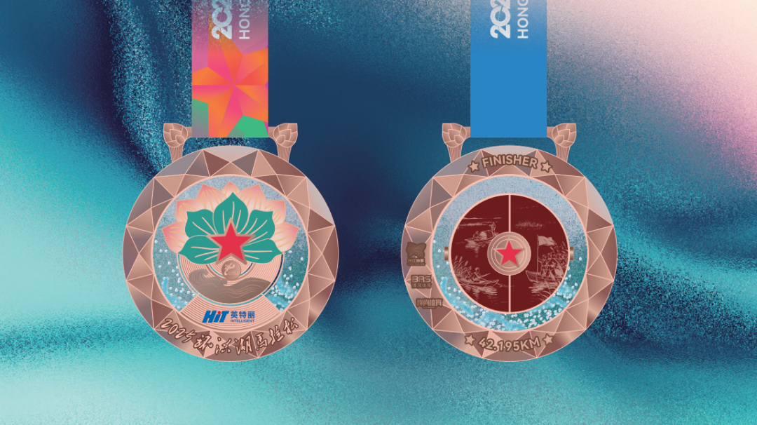 本届赛事全马奖牌为赤铜熔湖古铜色,半马奖牌为霁月湖心古银色,健康跑奖牌为烽火流金古金色。奖牌以洪湖最具代表性的生态元素荷花为核心灵感,整体设计兼具艺术美感与工艺创新。正面以浮雕工艺呈现盛放荷花与莲叶,象征洪湖“百里荷廊”的生态名片,中央镶嵌红五角星,致敬洪湖红色历史。背面则通过微雕工艺再现《洪湖赤卫队》经典场景,并创新设计“开合装置”,内藏水墨风格洪湖生态长卷,沙粒流动模拟湖波荡漾,寓意跑者与自然共鸣。