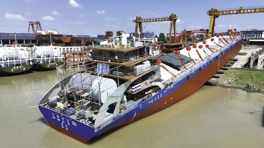 ▲7月28日,长江首艘纯甲醇动力智能船“长航货运006”轮在枝江下水。