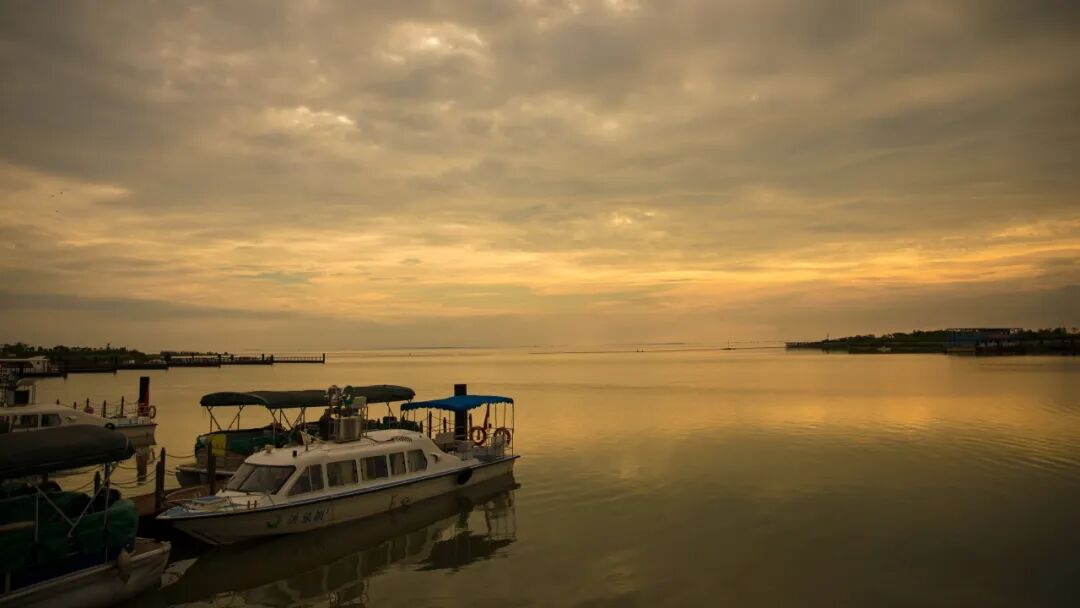 傍晚乘船从洪湖旅游港出发,捕捉内荆河与长江交汇的壮美瞬间。