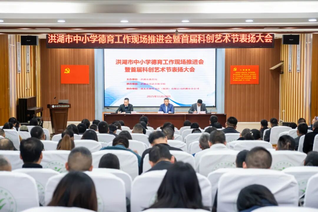11月28日上午,洪湖市德育工作现场推进会暨首届科创艺术节表扬大会在洪湖市双语实验学校举行。来自全市市直学校、乡镇中心学校的分管校长、德育负责人及受表彰代表200余人齐聚一堂,通过沉浸式观摩、经验分享、表彰激励、部署推进,共同勾勒洪湖教育“五育融合”的发展新蓝图。