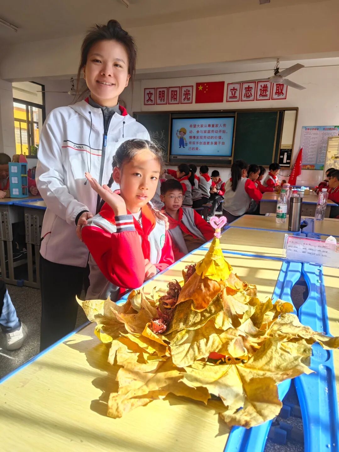 随后,与会人员分组走进不同学段的主题班队会课堂:在1—2年级“文明礼仪伴我行”班会上,孩子们唱着文明礼仪歌,在歌声中学习校园礼仪的点点滴滴;在3—4年级“雷锋精神代代传”队会中,师生分享“帮邻居奶奶取快递”“拾金不昧”的身边故事,手绘的雷锋漫画贴满了教室窗框与后墙;在5—6年级“劳动创造美”课堂上,“小学生创意劳动作品展”格外吸睛。学生们手持自制的小蓝鲸风向标演示风向原理,拾取公园秋日的落叶制成魔法帽子,简单的纸盒和塑料瓶在一双双巧手下变成了演绎动能的奇思妙物,“劳动最光荣”的理念就这样在动手实践中住进了童心。
