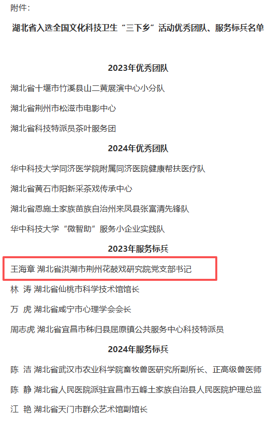 王海章,男,中共党员,湖北省洪湖市荆州花鼓戏研究院党支部书记。