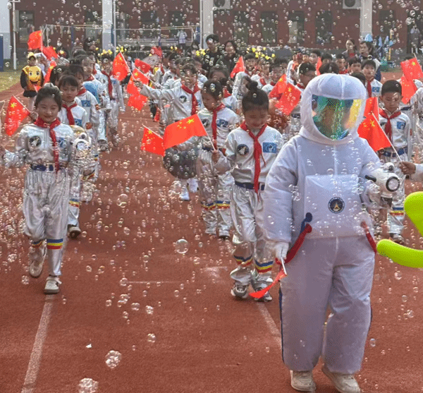 开幕式现场,气氛热烈而庄重。当师生们围绕科技主题进行的创意方阵出场时,全场观众的目光瞬间被吸引。有的方阵以浩瀚星空为主题,同学们头戴自制的星空帽,手持道具,仿佛在探索神秘的太空世界;有的方阵以中国天宫空间站为灵感,身着白色宇航服,迈着坚定的步伐,展现了中国航天的宏伟气势;还有的方阵以“神舟系列飞船”为元素,手持精心制作的各类航天器、火箭等手工品,展示了中国科技的强大实力。这些创意方阵不仅展示了同学们的创造力和想象力,也让大家感受到了科技的魅力。
