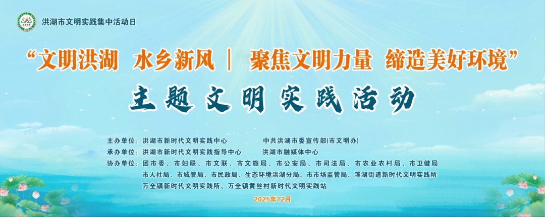 为深入学习贯彻习近平生态文明思想,扎实推进洪湖流域综合治理,深化农村精神文明建设,洪湖市新时代文明实践中心、中共洪湖市委宣传部(市文明办)将于12月8日在万全镇组织开展“文明洪湖 水乡新风”文明风尚提升行动暨“聚焦文明力量 缔造美好环境”主题文明实践活动。邀您携手共建景美人和、宜业宜居的文明乡村!