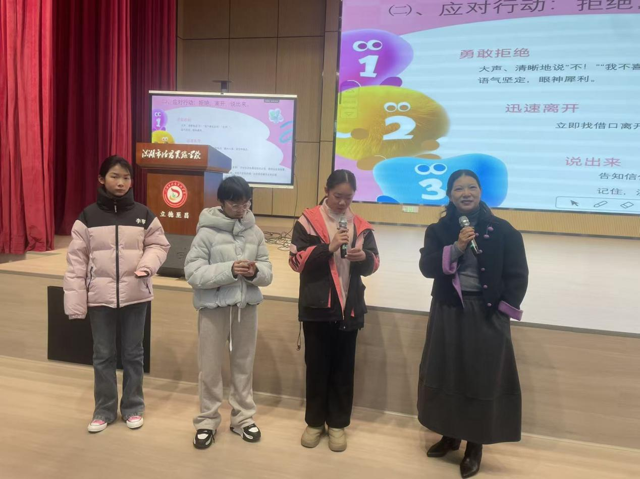 此次活动得到多方专业力量支持,洪湖市人民法院诉讼服务中心副主任黄静及随行工作人员冯家怡,荆州市王霞名师工作室主持人王霞、教科研中心教研员崔静芳受邀莅临指导。活动中,崔静芳老师从科学关怀的视角出发,围绕“认识自我、接纳自我、保护自我”核心主线,从生理健康、心理成长与安全防护三个维度层层递进,为同学们构建起完整的自我认知与安全防护知识体系,助力大家以自信从容的姿态应对青春期挑战。为增强互动性与学习效果,崔老师还巧妙设计了多个贴近学生心理的小游戏,引导同学们在轻松参与中深入认知自我、学会接纳爱护自己,掌握实用的情绪处理方法。