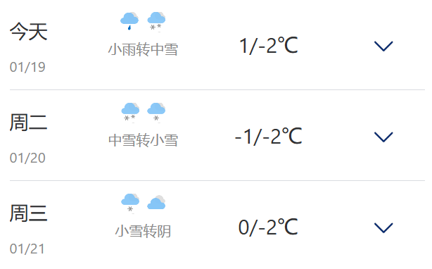 19日,小雨转中雪,有短时冻雨或冰粒,雨雪总量8~15毫米,其中冻雨量1~3毫米,降雪量3~5毫米。气温-1~6C,偏北阵风7~9级。