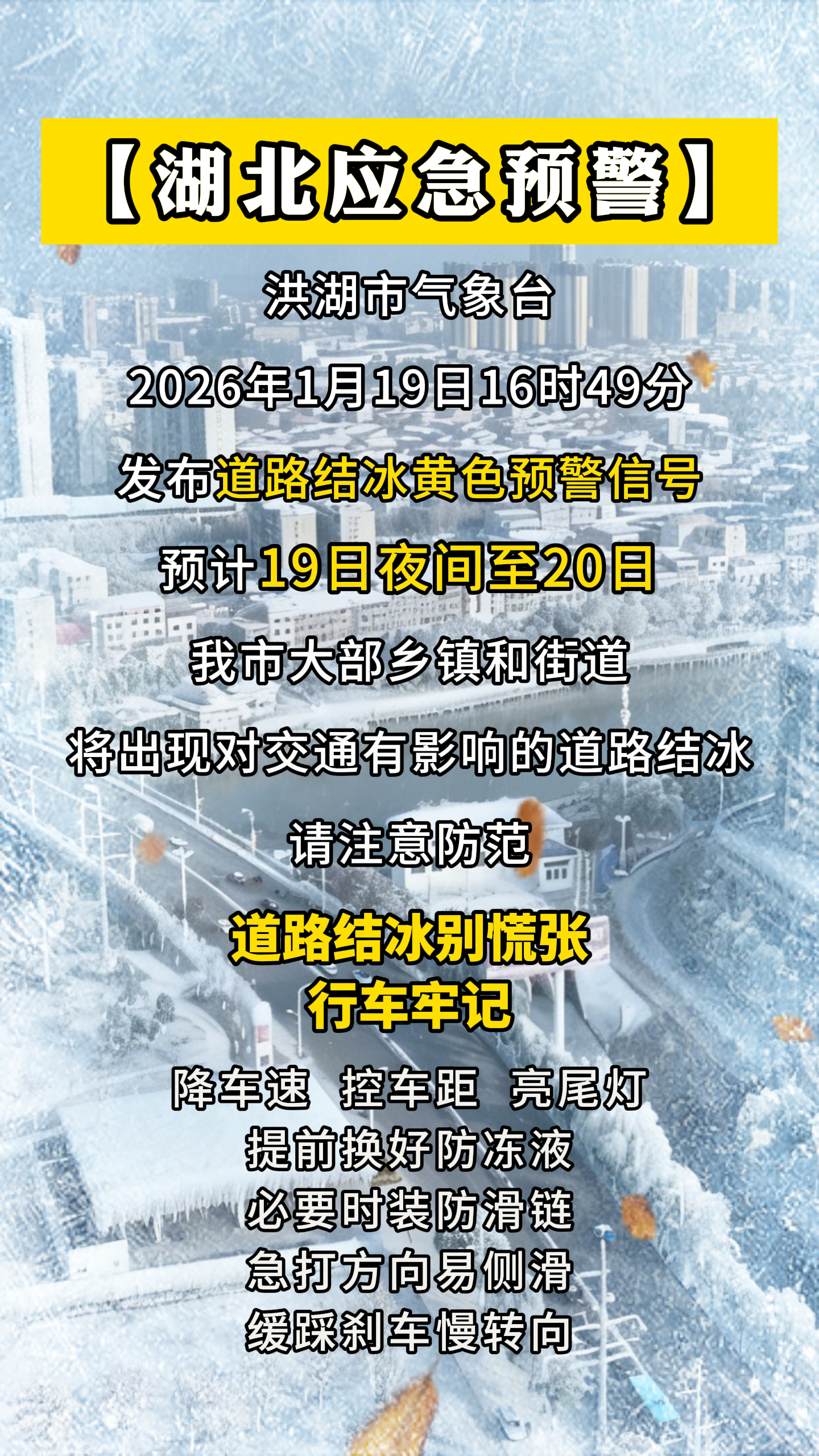 1月19日,交通部门按照道路结冰黄色预警,启动战时机制落实24小时巡查机制,投入11个应急组,车辆11台次、应急人员48人次,对国省干线丰白河桥、电排河中桥、大丰河桥、西干渠大桥、红三大桥、石码头电排河桥、白庙大桥、曹市一桥、新剅沟桥、大同桥、蔡家河新桥等重点桥梁和路段完成第一轮融雪剂撒布作业,撒布融雪剂20吨。本时段洪湖境内国省干线畅通,无拥堵、路面无结冰。