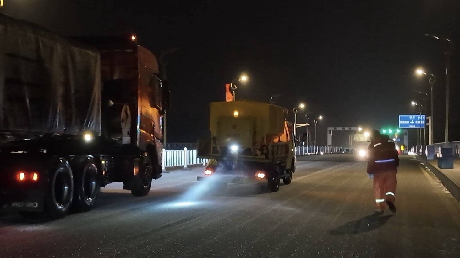 雨雪天气发生后,市交通运输局立即启动应急响应,实行24小时值班值守和桥梁动态巡查制度。通过“地面巡查+视频监控”立体监测模式,执法人员与养护队伍对跨河桥梁、高架匝道等重点部位加密巡查频次,紧盯夜间低温时段,实时掌握桥面结冰情况。作业中采用“预防性撒布+动态补撒”的方式,实现“雪下随清、雪停路畅”。同时,联合交警部门在桥梁两端设置警示标识,实行压速带道引导,提醒过往车辆减速慢行,防范交通事故发生。