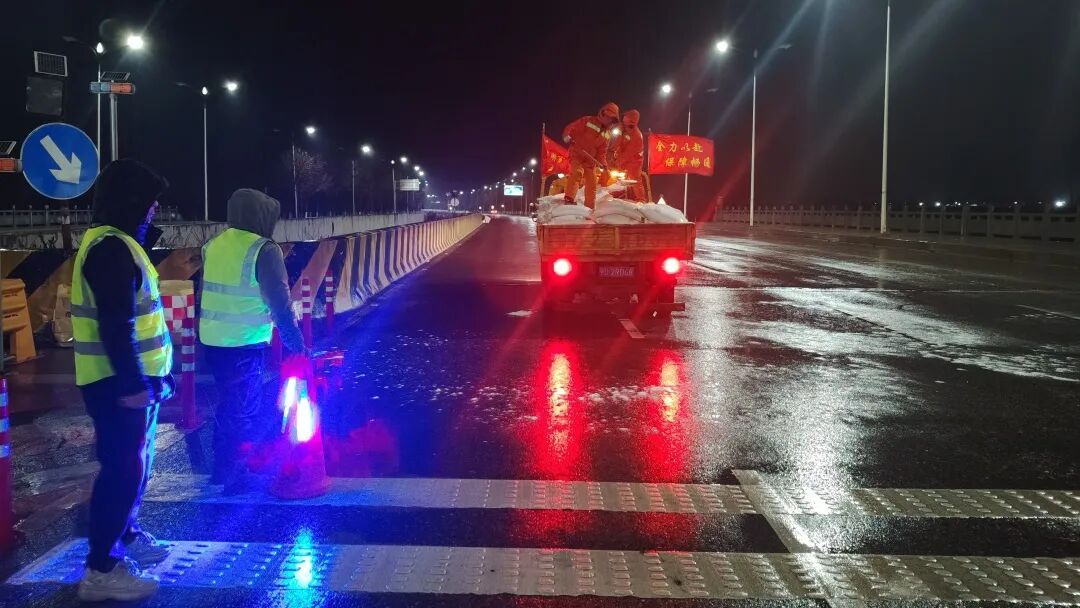 19日19时,投入33人次、11台次巡查车辆开展巡查,11个应急组出动48名人员、11台车辆,完成国省干线桥梁第一轮融雪剂撒布,重点对4座桥梁撒布融雪剂1吨;23时30分,再次投入同等巡查力量,应急人员增至86人,启动第二轮撒布作业。