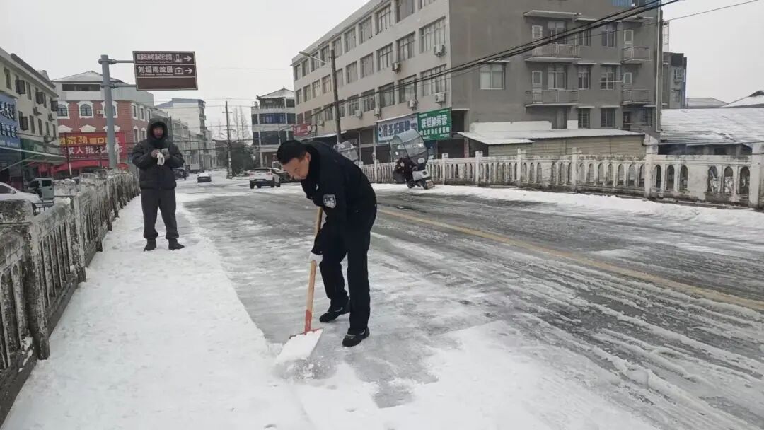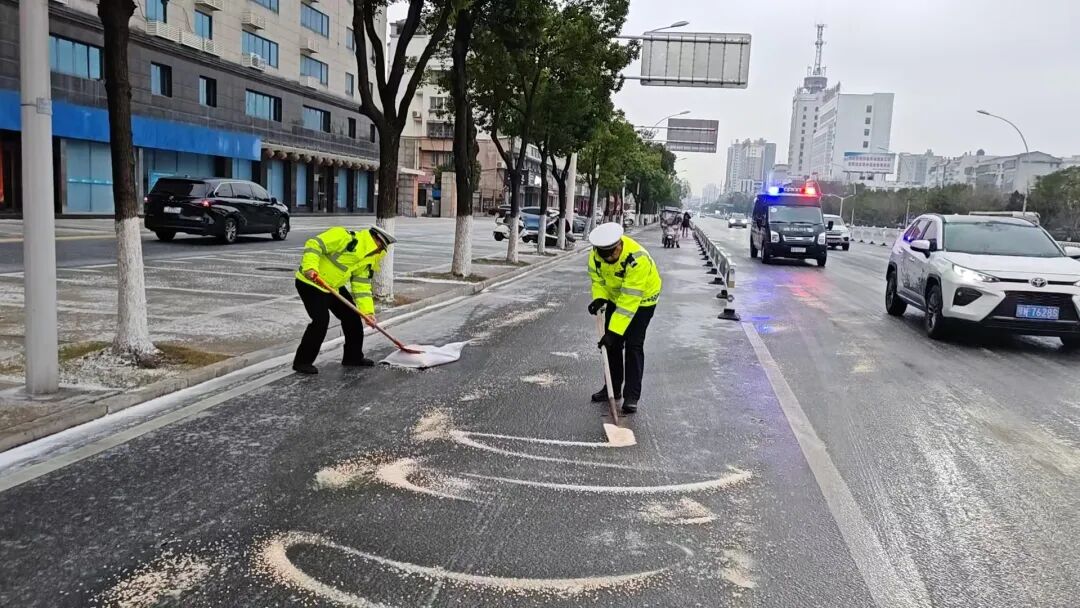针对城区主要路口、交通节点,交警、巡警及派出所民辅警采取“定点值守+动态巡逻”机制。执勤警力顶风冒雪,通过撒布融雪剂、铲冰除雪等作业,第一时间消除路面凝冻;同时,加强指挥疏导,引导车辆有序通行,最大限度减少交通拥堵与事故风险,全力保障交通安全。
