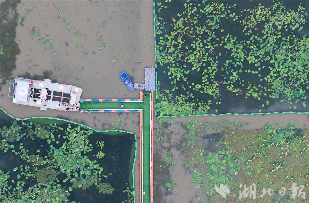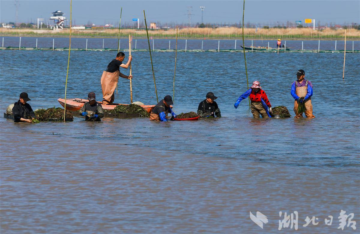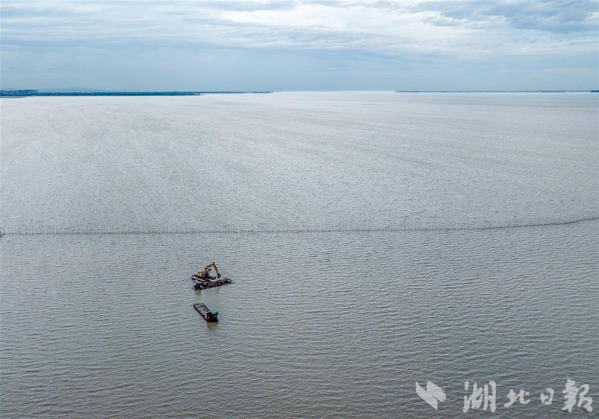 2025年8月27日,工人们在洪湖水域开展常态化巡护与清理作业,以确保阳光能够充分照射到湖底,为水生植物生长创造适宜环境。