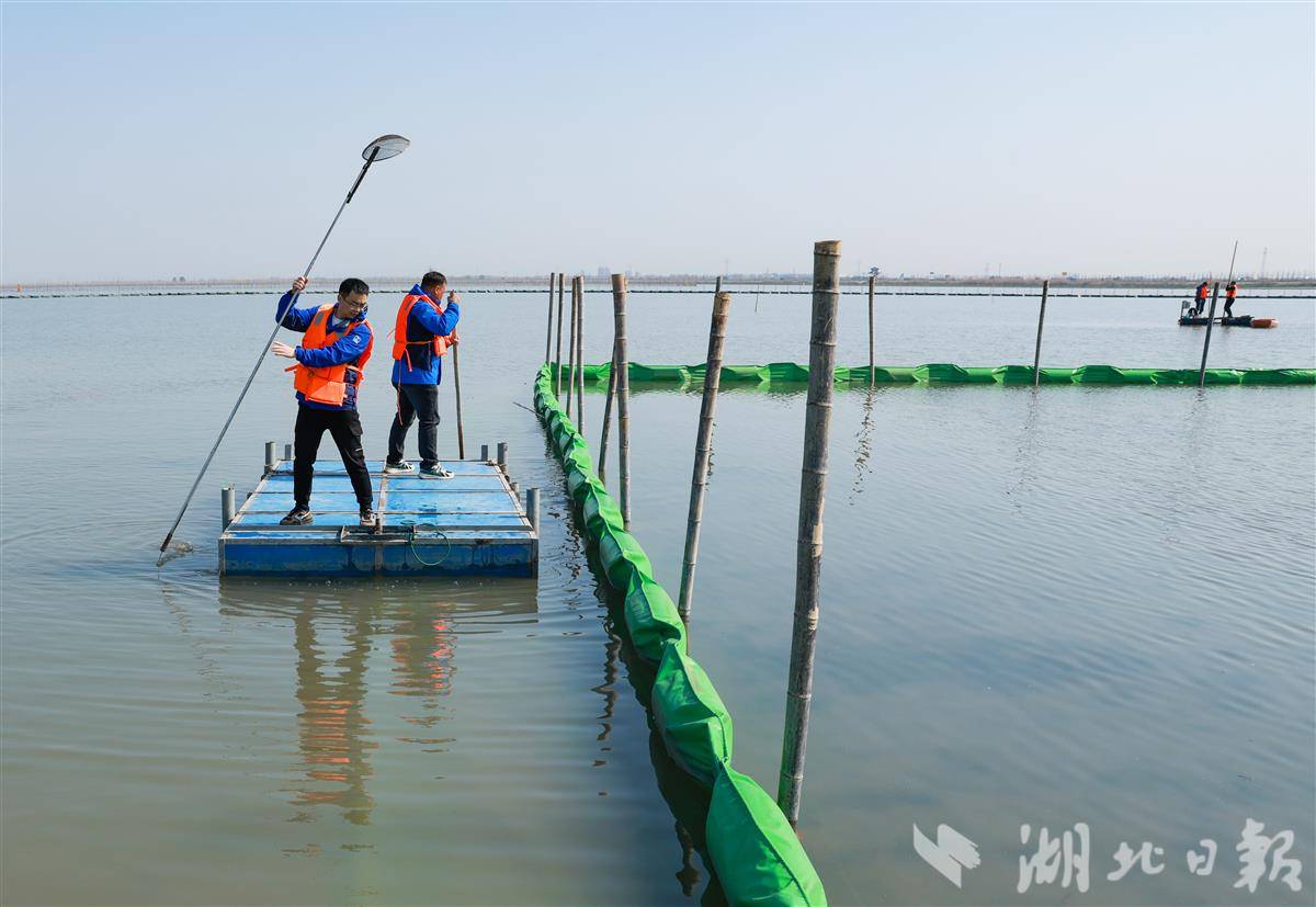 2025年3月19日,中建三局技术人员在护理洪湖修复试验区水草。