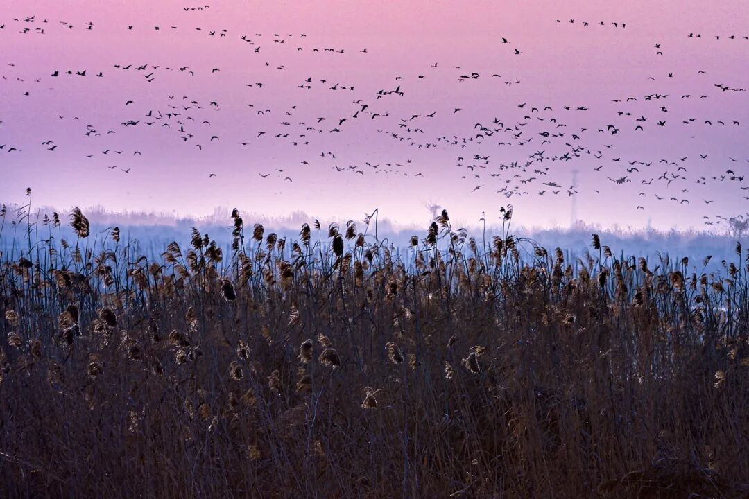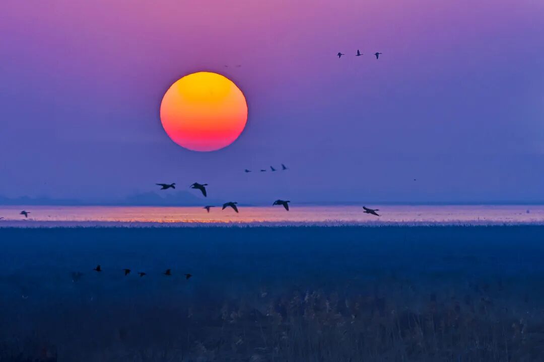 就在这羽翼交响的洪流中,夕阳正缓慢沉入地平线。天空从橙红渐变为蓝紫,天空如熔烧过的金属,那一刻光的色彩,把整片湿地染成琥珀色——芦苇的剪影、飞鸟的轨迹、微微荡漾的湖波,都凝固成一幅幅美妙静谧的画面,撼动的心灵,久久难以平息……