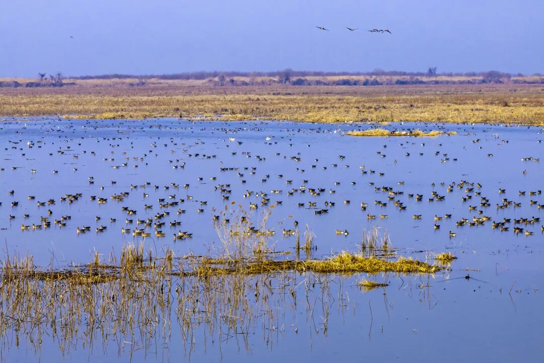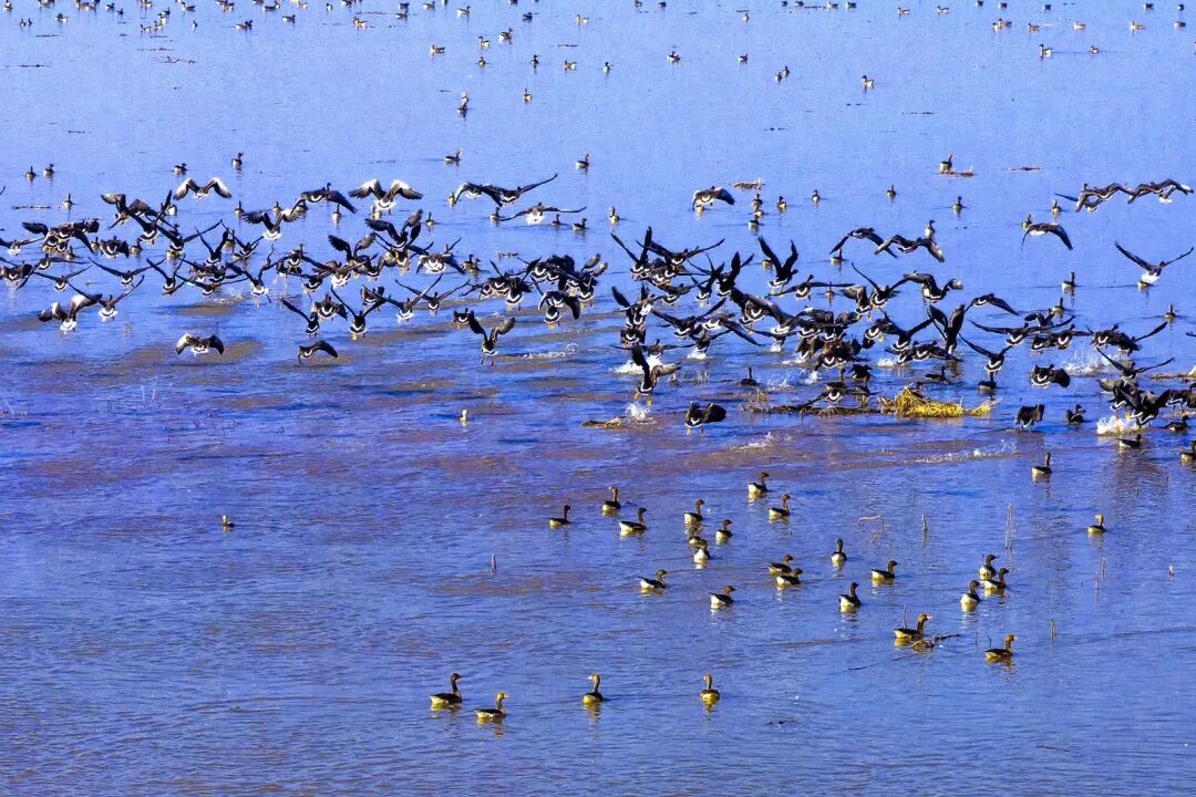 忽然,一阵清脆啼声划破湖面的宁静。紧接着,千万声鸣叫从静谧的湖面和苇海深处迸发,仿佛大地的交响乐。鸟阵踏破平静湖面跃出苇梢腾空而起。