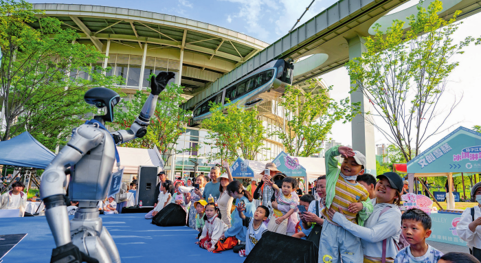 在武汉光谷空轨高新大道站,人形机器人与游客互动(2025 年 5 月 1 日摄)魏铼摄