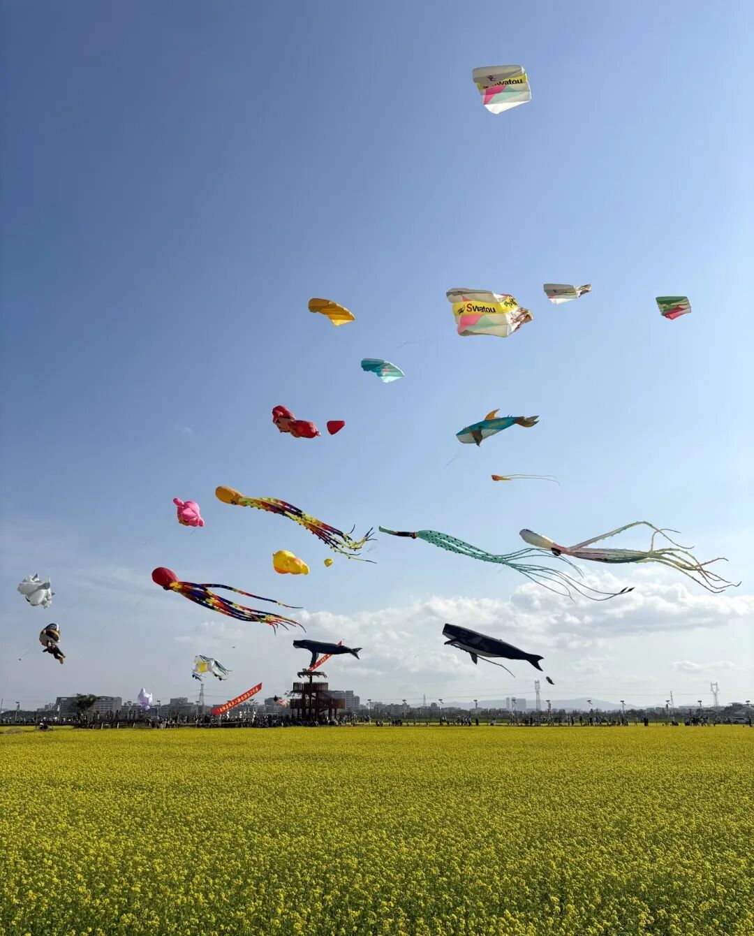 开幕式后长龙、蝴蝶、沙鸥等造型巨型风筝齐飞,搭配花海航拍,视觉震撼拉满;