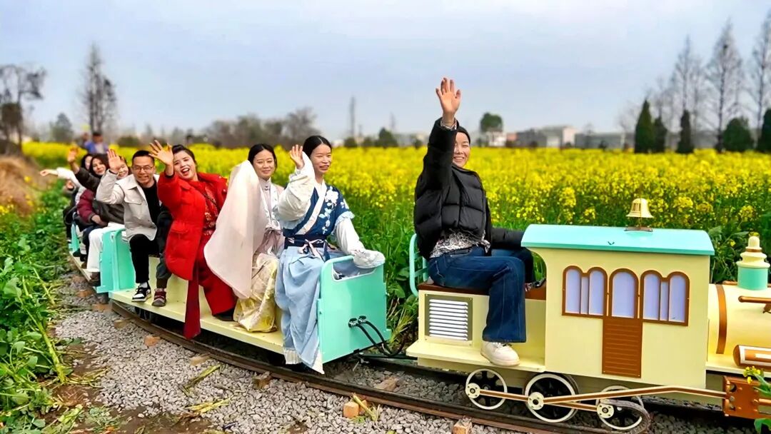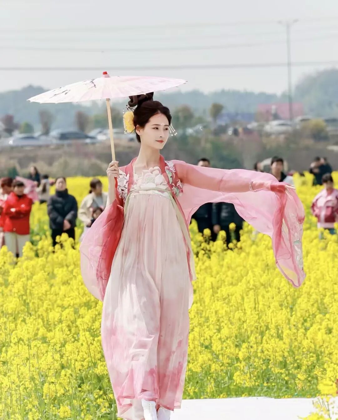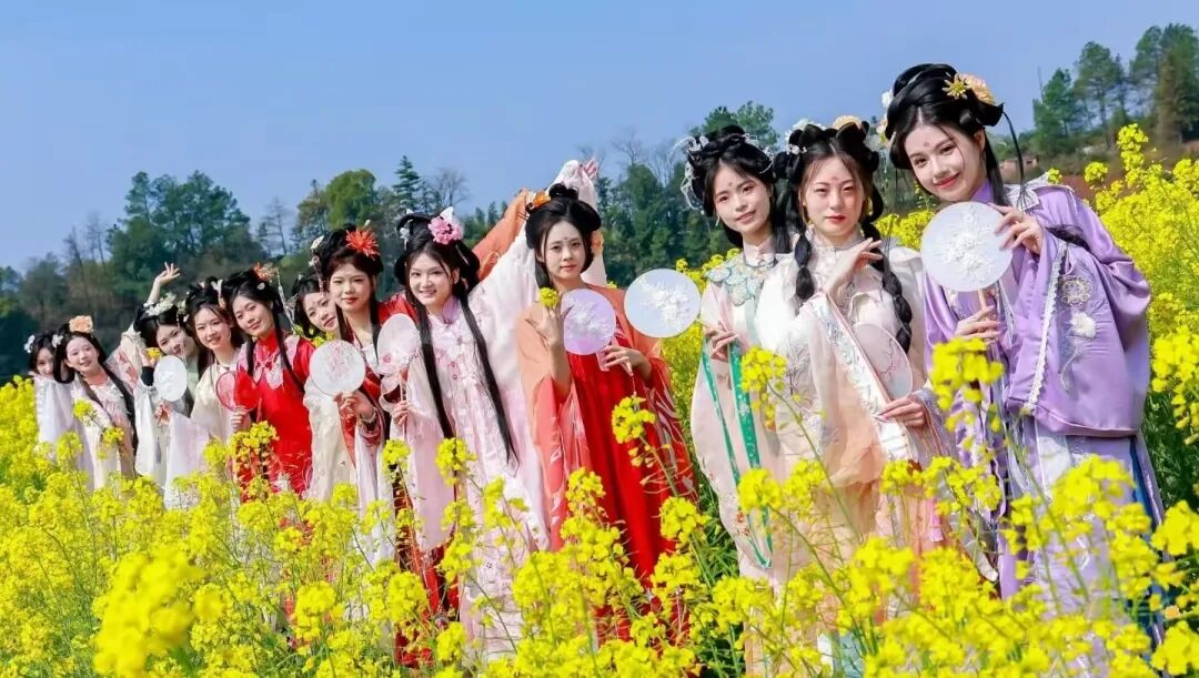汉服花神携侍女、民乐随行,沿花海栈道定点互动,簪花赠福、打卡合影。