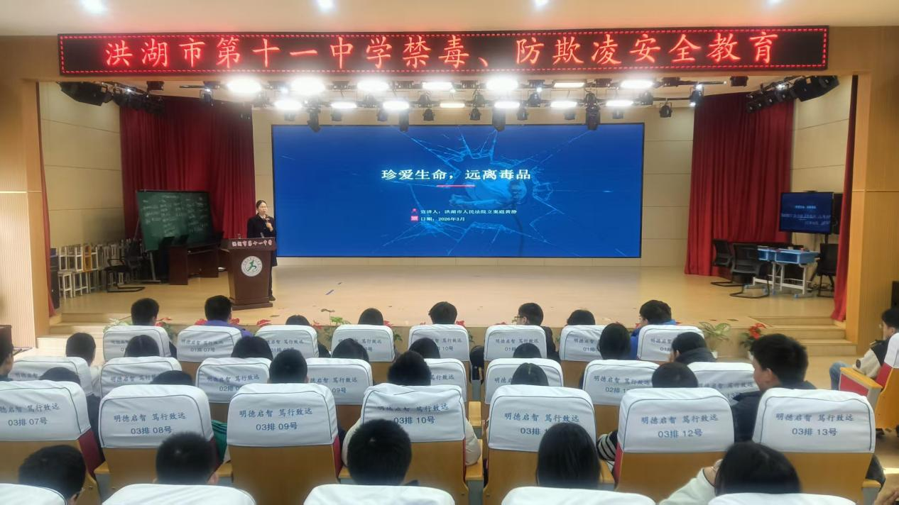 为进一步增强青少年法治观念,提升自我保护意识与能力,筑牢平安校园安全防线,近日,洪湖市第十一中学特邀法治副校长进校园,开展以 “远离毒品、防范校园欺凌” 为主题的法治教育专题讲座。