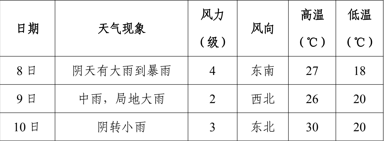 预计8日至9日白天我市有大雨到暴雨,过程累计雨量40~80毫米,局地100毫米以上,并伴有强对流天气,最大小时雨强20~50毫米,阵风8~10级,局地可能有小冰雹。降雨最强时段为8日傍晚9日上午。