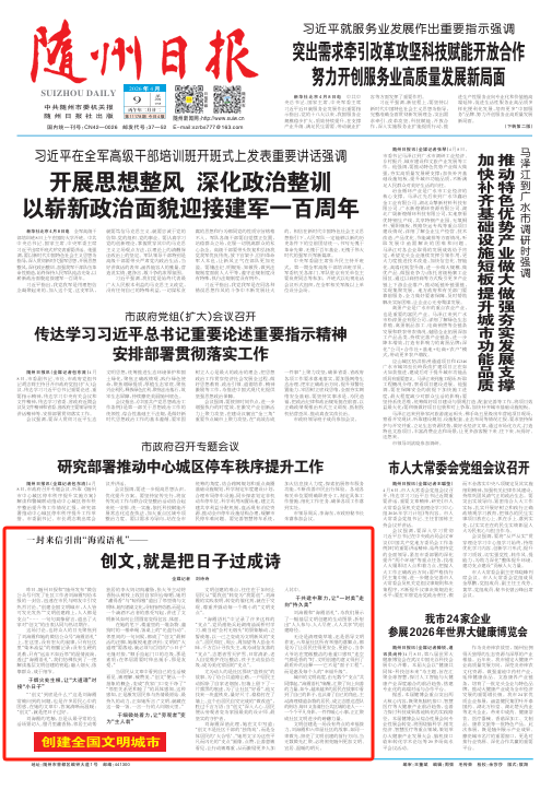 近日,随州日报和“随州发布”微信公众号刊发了社区工作者刘海霞写给本报的一封信,迅速在市民与网友中引发热烈讨论。“创建全国文明城市,人人皆可发光发热”“文明创建路上,人人都是支点”…… 一句句真挚留言,道出了大家对“创文”的由衷认同与热切期许。
