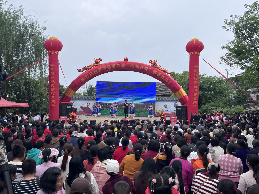 活动现场,红色的充气拱门高高矗立,“热烈庆祝燕窝镇第二届‘四季村晚’圆满成功” 的标语醒目亮眼,两侧立柱上 “琴箫婉转赋美乡村舞太平,锣鼓铿锵声携酒菜香天下” 的对联,道尽了这场盛会的烟火气与文化味。舞台前,数千名村民早早围坐,老人、孩子、青年们齐聚一堂,掌声、欢呼声此起彼伏,现场人头攒动、热闹非凡,横幅上 “丰富农村文娱,助力乡村振兴” 的标语,更彰显了这场村晚的初心与使命。