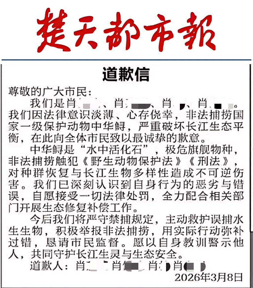 “我们因法律意识淡薄,非法捕捞国家一级保护动物中华鲟,严重破坏长江生态平衡,在此向全体市民致以最诚挚的歉意。”3月17日,在《楚天都市报》上刊登的一封致歉信,引发关注。