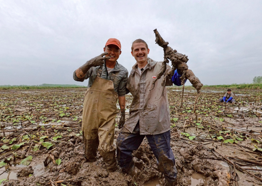 在洪湖市新滩镇新生村,中外青年博主步入荷塘,开启原生态挖藕体验。从辨识莲藕生长脉络、精准定位深埋水下的根茎,到徒手轻柔清理淤泥、平稳托举完整藕节,每一个环节都充满了新鲜感与挑战性。大家在亲身实践中,探寻莲藕生长的秘密,真切感受到新时代“鱼米之乡”的深厚底蕴。