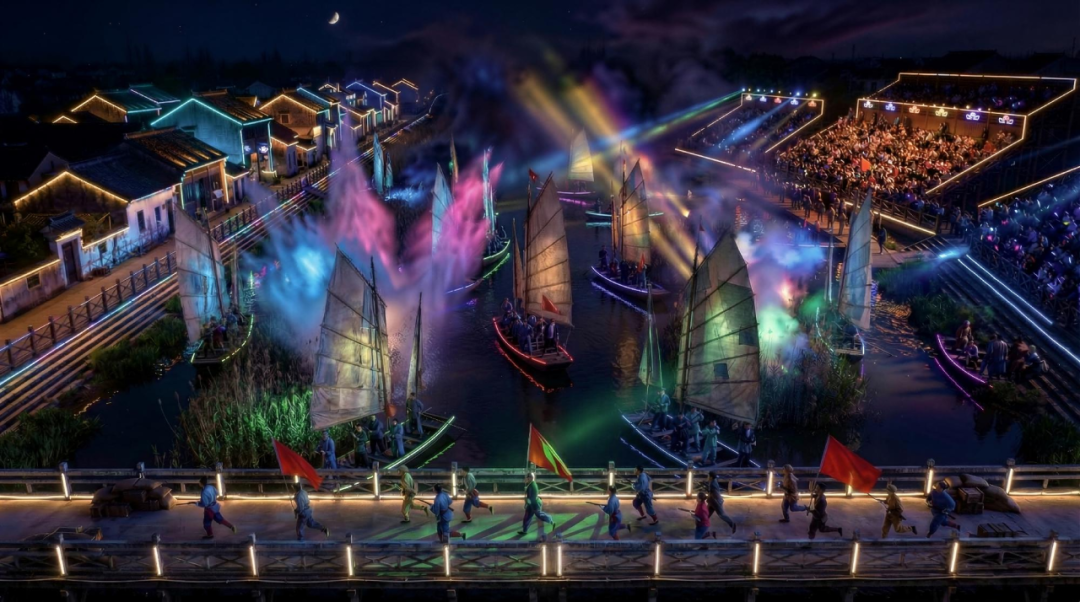 依托内荆河水域,运用水幕投影、烟火特效、战船实景等多元手段,生动还原赤卫队员巧布疑阵、智斗敌军的经典场面。当“枪炮”响起、“战船”冲出芦苇荡,水花四溅、硝烟弥漫,沉浸式感受洪湖儿女的英勇与智慧,重温革命豪情。