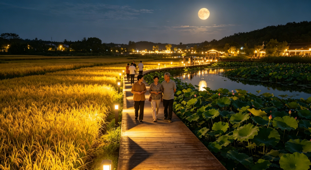 漫步在稻田边的荷塘景观,走在栈道上散步赏景、邻里交流,也是夜游打卡好去处。