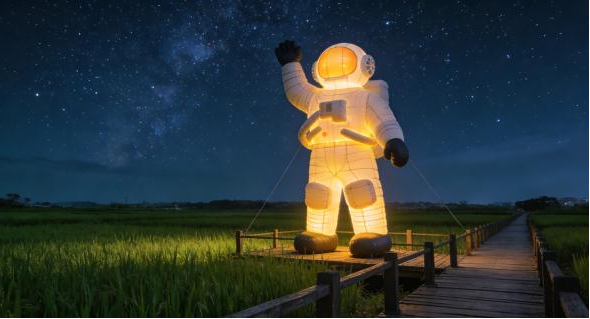 夜幕降临,稻田化身梦幻秘境,三大光影场景(太空梦·航天员气模矩阵、奇幻梦·稻田激光秀、传统梦·非遗鱼灯巡游)轮番上演,随手出大片,解锁乡村新玩法。
