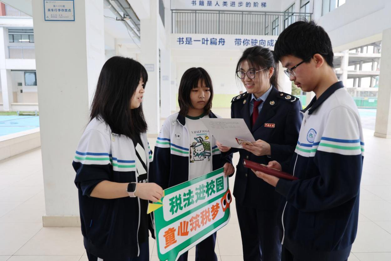 在校园走廊,税务干部结合青少年的认知规律和兴趣特点,摒弃传统说教式宣传模式,精心设计了“生活场景识税”“趣味抢答猜税”等互动环节,让税法宣传变得生动有趣。“生活场景识税”环节中,税务干部展示了超市购物、图书馆阅读等贴近青少年生活的场景图片,引导学生仔细观察场景中的税收元素,讲解商品价格中包含的税款、公共设施建设背后的税收支撑;“趣味抢答猜税”环节则围绕税收基础知识设置趣味题目,学生们踊跃举手、积极抢答,现场气氛热烈,在欢声笑语中加深了对税法的初步认知,成功将抽象难懂的税法条款转化为鲜活可感的生活常识。