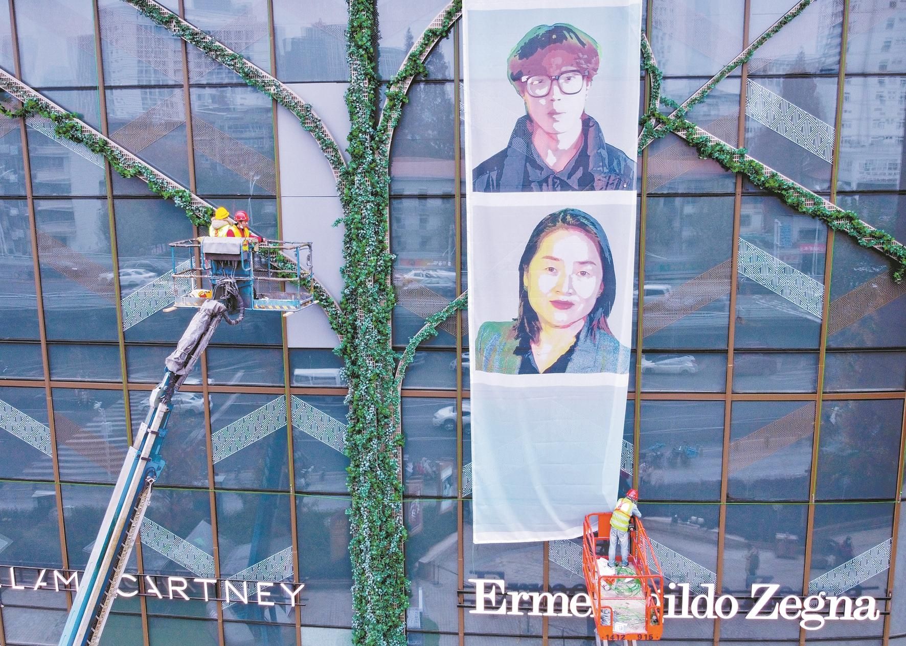 500张肖像照制作完成后,武汉K11拿出整个购物中心的外立面,做这一艺术项目的呈现场地。如此巨大的面容“墙绘”是由多条画幅组成,由30位工作人员,5台登高车,历时3天,日夜兼程拼挂完成。