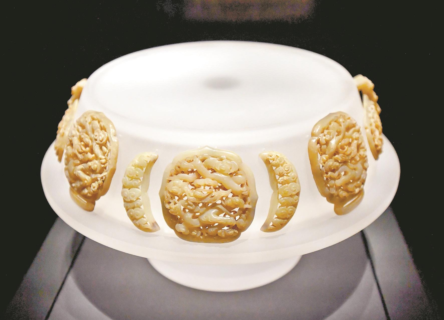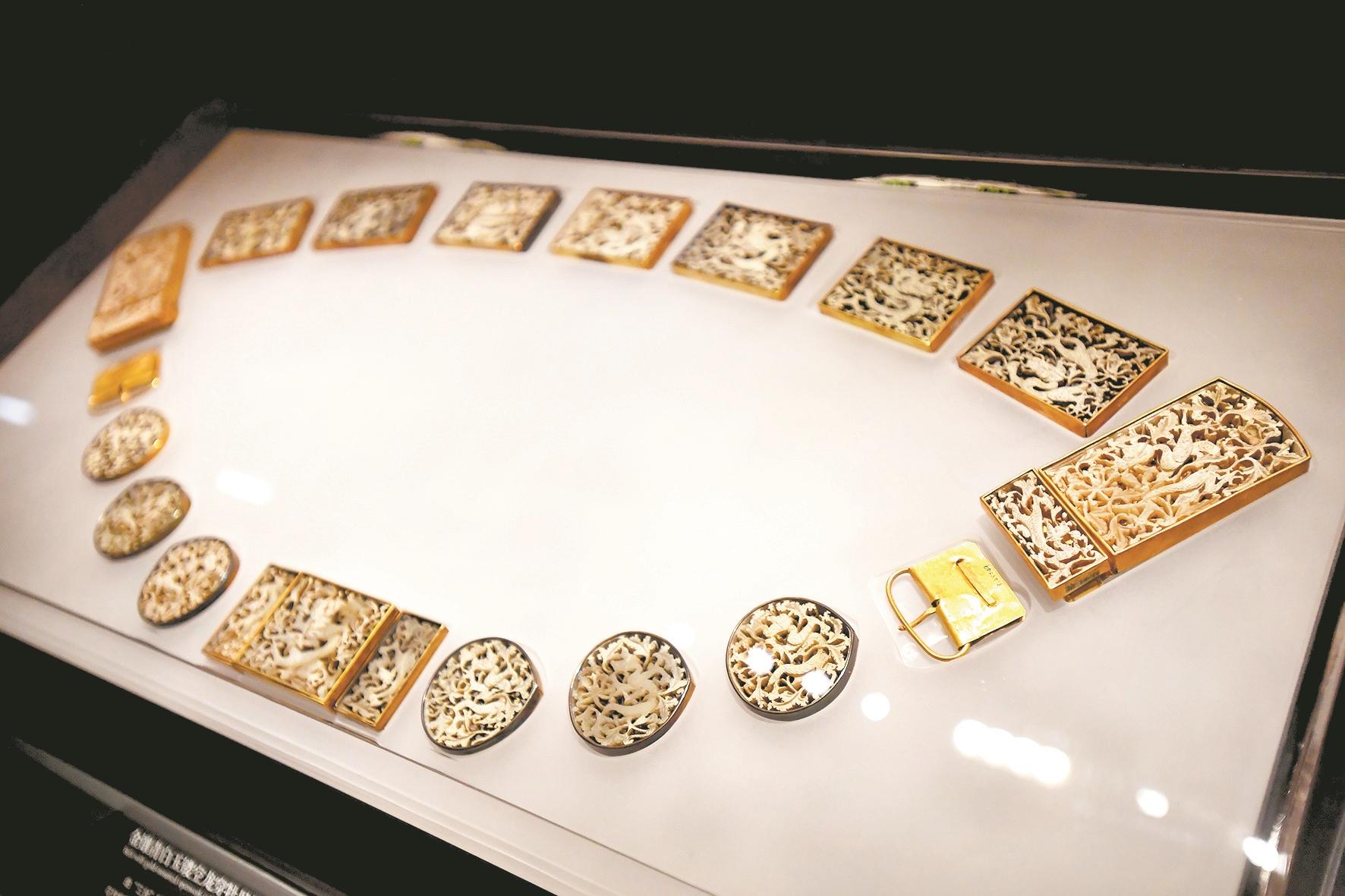 金镶青白玉镂空龙穿牡丹纹带。摄影:楚天都市报极目新闻记者 萧颢